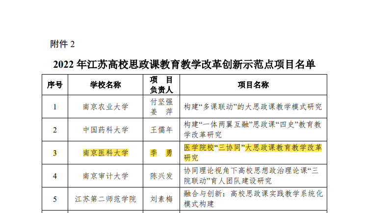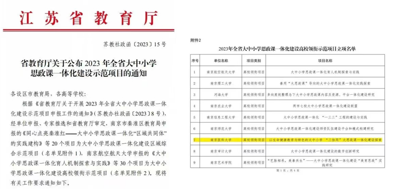 学院入选国家级一流本科课程3门,省级本科课程思政示范课程1门,省级通识课程立项建设1门。获批江苏高校思政课教育教学改革创新示范点项目《医学院校“三协同”大思政课教育教学改革研究》,江苏大中小学思政课一体化建设高校领衔项目《以生命健康教育为特色的大中小学“三协同”大思政课一体化建设探索》;《医患沟通学》《医学伦理学》获批教育部高等教学医学人文素养与全科医学教指委“医学人文课程思政教学指南编写”项目,并皆以优秀等级结项。