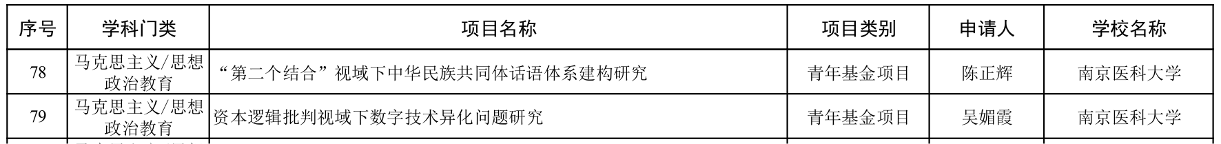 陈正辉老师申报的《“第二个结合”视域下中华民族共同体话语体系建构研究》和吴媚霞老师申报的《资本逻辑批判视域下数字技术异化问题研究》获批马克思主义/思想政治教育门类青年基金项目立项。文阡箫老师申报的《战后美日对华核叙事的体系构建与因应策略研究》获批交叉学科/综合研究门类青年基金项目立项。