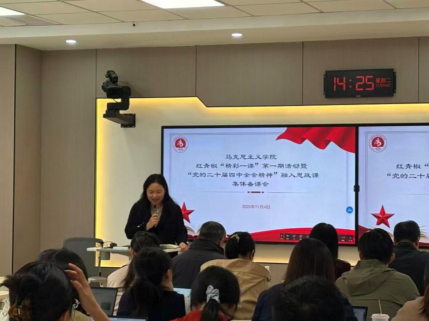 为深入学习贯彻党的二十届四中全会精神,提升思政课教学质量,11月4日,马克思主义学院举办红青椒“精彩一课”第一期活动暨“党的二十届四中全会精神”进思政课集体备课会。本次活动邀请南京工业大学马克思主义学院院长眭国荣教授,我院巩茹敏院长、郭玉宇副院长、李勇教授担任评审专家。活动由郭玉宇副院长主持,马克思主义学院全体“红青椒”培养对象参加。